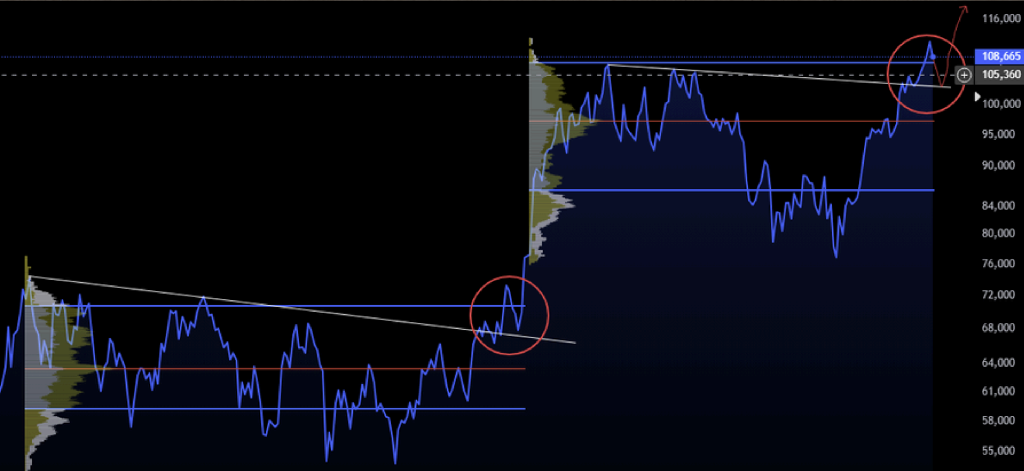Het meest logische scenario is dat we een wick maken naar die liquidity zone en weer binnen de triangle traden. Mochten we niet binnen de triangle sluiten en een test doen op de onderste diagonaal is dit het moment om een short te plaatsten. Echter is er lager weinig liquidity te vinden. Toch zie ik graag dat we die $102.000 pakken en omhoog vliegen.