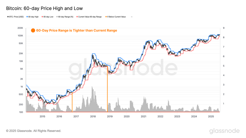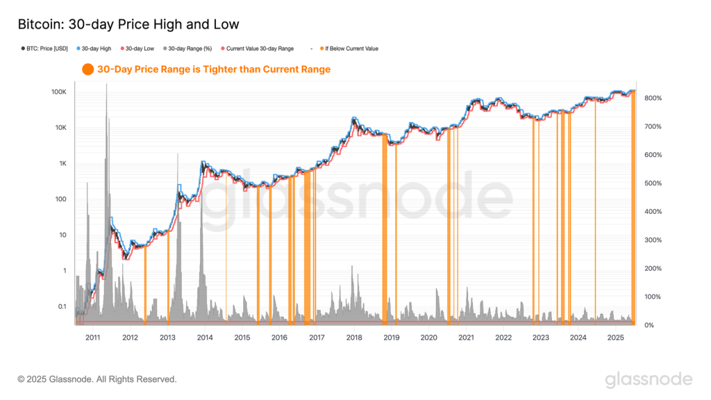 Sinds begin deze maand schommelt de Bitcoinprijs vlak onder het hoogste punt ooit: $111.700. De koers beweegt vrijwel zijwaarts, in een steeds nauwere prijsvork.