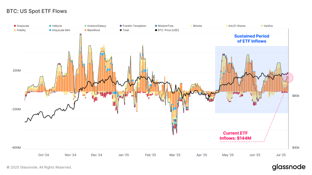 Amerikaanse Bitcoin-ETF’s zorgen nog steeds voor veel vraag. Afgelopen week was er wel een afname in instroom, met slechts +144 miljoen dollar aan nieuw geld.