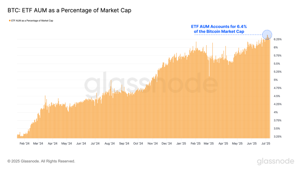 De ETF’s vertegenwoordigen nu 6,4% van de totale waarde van alle Bitcoins die bestaan. Dat is een record. Steeds meer Bitcoins worden dus gekocht via gereguleerde beleggingsproducten, wat de koppeling tussen Bitcoin en traditionele financiële markten verder versterkt.