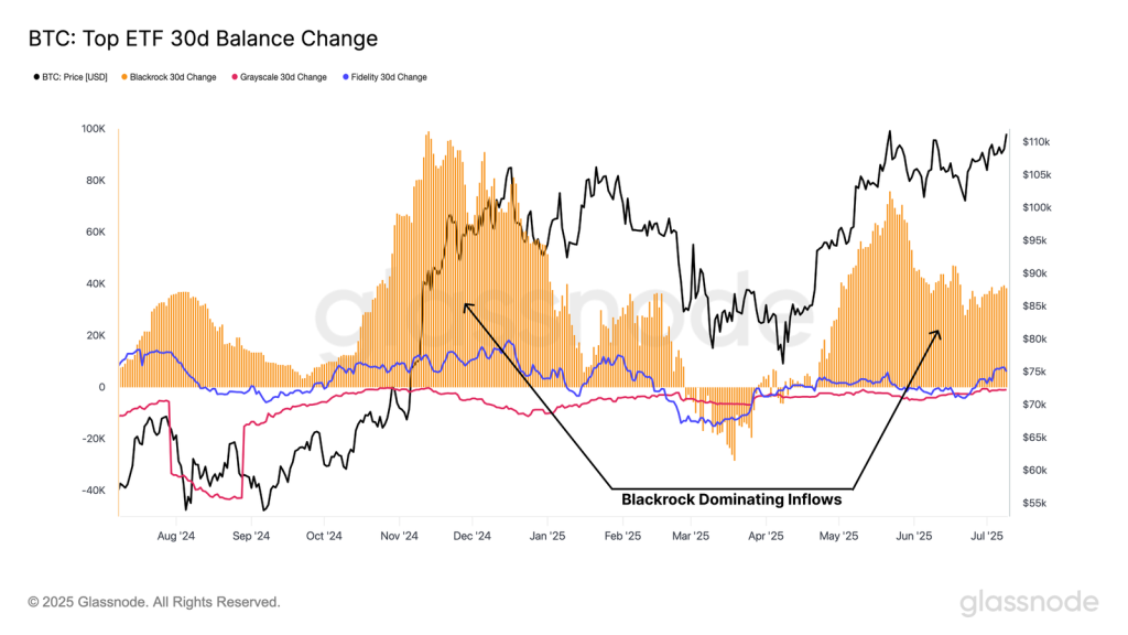 Als je kijkt naar de veranderingen over 30 dagen, zie je dat BlackRock bijna alle groei naar zich toe trekt. Fidelity en Grayscale stageneren.