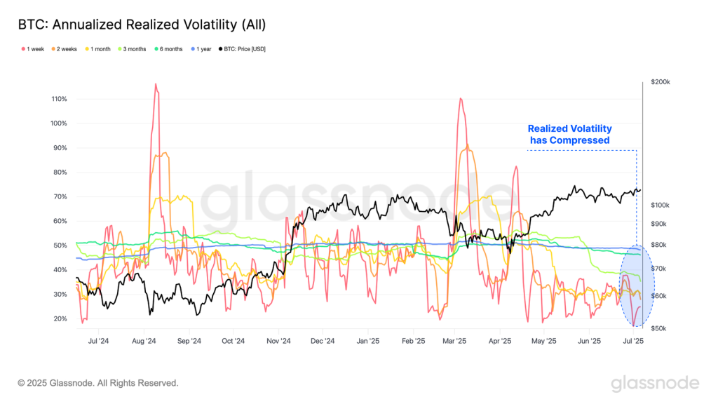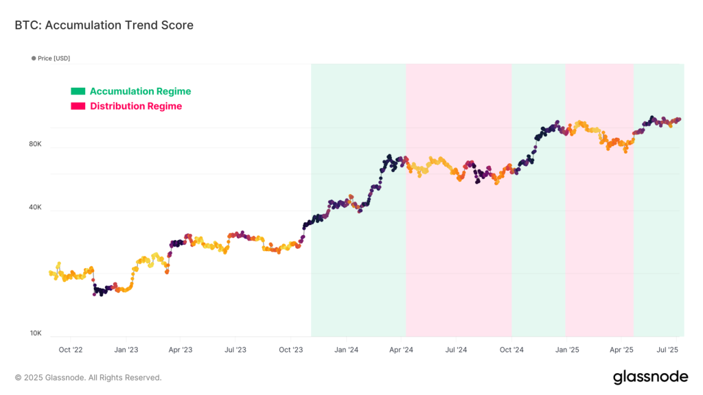 De druk op de accumulatie blijft sterk, volgens verschillende meetmethodes. Dat wijst erop dat het aanbod van Bitcoin steeds krapper wordt. Tegelijkertijd bouwt de volatiliteit zich stilletjes op, zowel op de blockchain (on-chain) als in de derivatenmarkten.