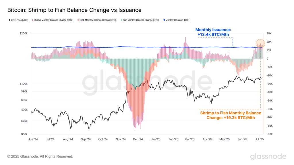 Aan de hand van verschillende meetmethodes lijkt het erop dat beleggers eerder kiezen om Bitcoin te kopen (accumuleren) dan om te verkopen. Opvallend is dat het aantal munten in handen van langetermijnhouders blijft stijgen. Ook kleine beleggers (Shrimps <1 BTC, Crabs 1–10 BTC en Fish 10–100 BTC) kopen gezamenlijk zo’n 19.300 BTC per maand, terwijl er maar 13.400 BTC per maand worden gemined.