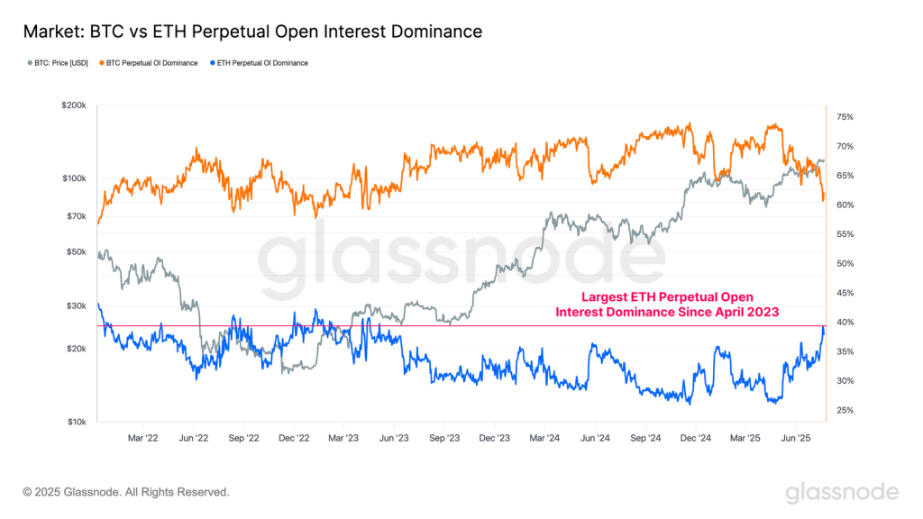 Bij de open interest‑dominantie blijkt dat Ethereum‑posities veel sneller groeien dan Bitcoin‑posities: