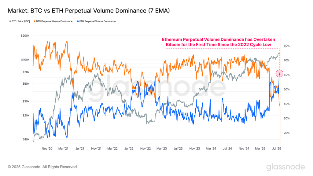De altcoin‑sector had in deze cyclus grotendeels ondergepresteerd. De recente prestatiespike markeert een belangrijke gedragsverandering bij beleggers, vooral in perpetual futures, waar Ethereum’s dominantie een recordhoogte bereikte en Bitcoin voor het eerst sinds 2022 passeerde.