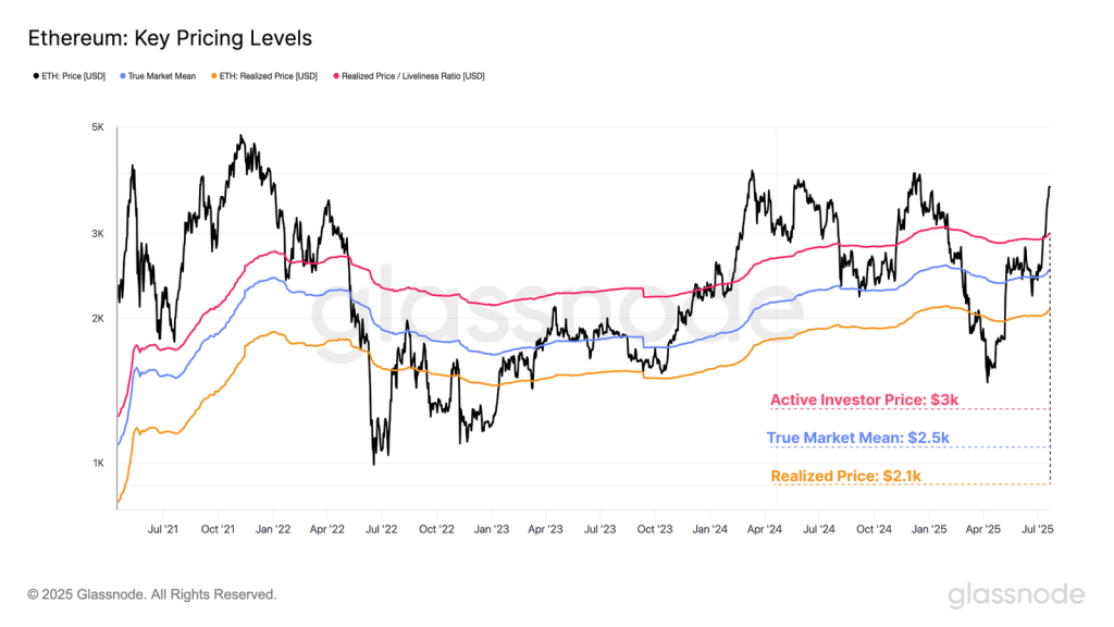 Kijken we naar waarderingsmodellen en volumeprofiel, dan vormen de True Market Mean en Active Realized Price twee aangepaste kostenbasismodellen (exclusief verloren en slapende munten). Deze geven een duidelijker beeld van de gemiddeld betaalde prijs door actieve beleggers versus de gerealiseerde prijs (gemiddelde kostenbasis per ETH).