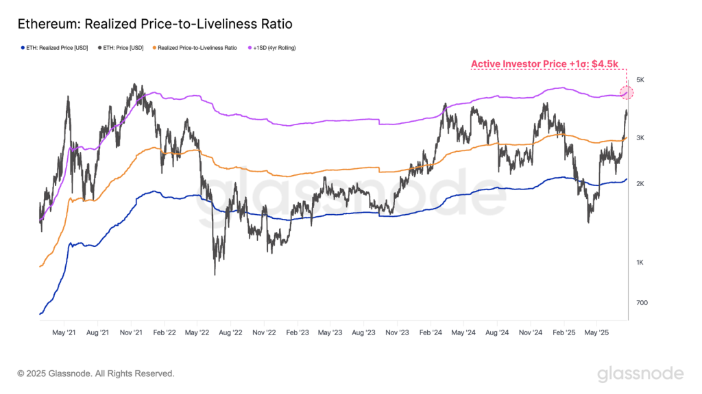 Voor upside-doelen kijken we naar de +1 standaardafwijkingsband van de Active Realized Price. Dit fungeert als drempel waar verkoopdruk kan toenemen. Momenteel ligt dit +1σ‑niveau op $4.500, wat in de huidige markt als oververhit geldt.