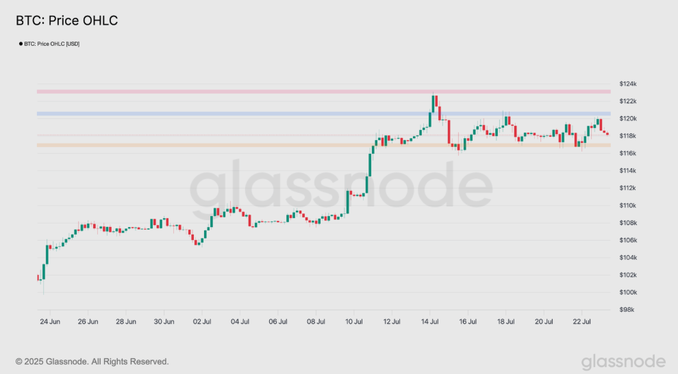 Juli was een explosieve maand voor Bitcoin, met een sterke toename van opwaartse volatiliteit: de prijs steeg van een weeklaagte van $105,4 K naar een nieuw hoogste punt ooit van $122,7 K. De kortetermijnmomentum koelde later in de week af, en sindsdien consolideert en wikkelt de koers zich net onder het hoogste punt ooit.