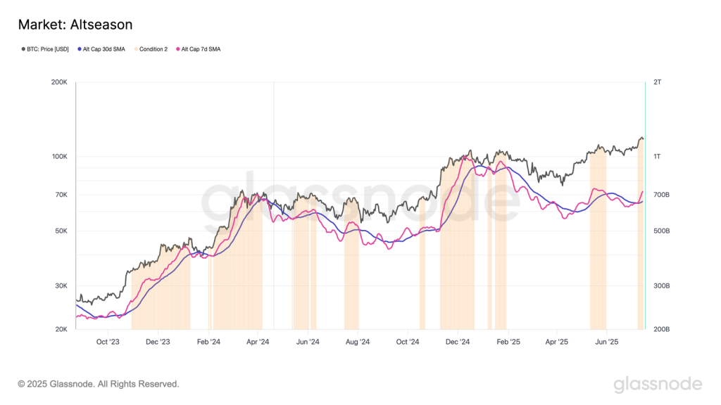 Volgens dit model ontstonden Altseason-omstandigheden op 9 juli en zijn ze sindsdien actief, wat wijst op herverdeling van kapitaal over de crypto-landschap.