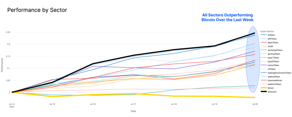 - Alle altcoin-sectoren presteren beter dan Bitcoin in de afgelopen week, met name Ethereum. Dit resulteerde in een stijging van de totale marktkapitalisatie van altcoins met $216 mrd in de afgelopen twee weken.