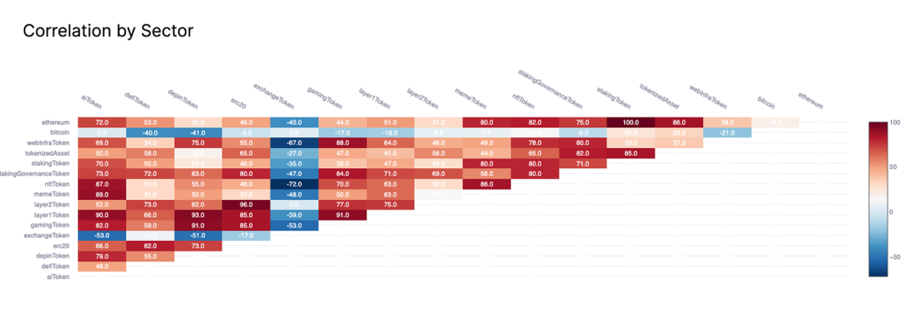 Deze trend wordt versterkt door sectorcorrelaties. Vrijwel alle altcoin-sectoren bewegen nu in nauwe samenhang, wat wijst op een brede marktrally die losstaat van asset-specifieke fundamenten. Tegelijkertijd zijn de correlaties tussen altcoins en Bitcoin sterk gedaald, wat de divergentie in koersgedrag benadrukt.