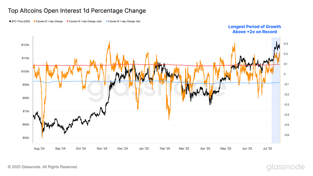 De dagelijkse toename van open interest blijft al meer dan 12 opeenvolgende dagen boven de +2 standaardafwijking, de langste reeks ooit. Dit benadrukt zowel de schaal als de aanhoudende aard van de open interest‑uitbreiding en suggereert een betekenisvolle verschuiving in speculatief gedrag.
