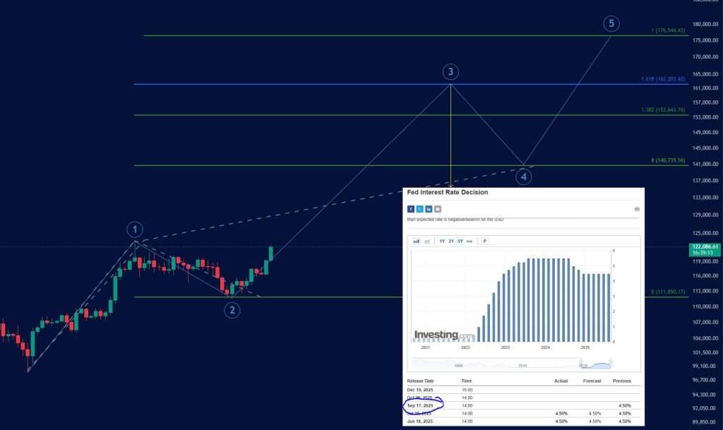 Ik zie in de huidige Elliott Wave-structuur ruimte voor een koersstijging richting 162.000 dollar medio september. Een renteverlaging door de FED zou de liquiditeit op financiële markten vergroten en investeringen in risicovolle activa stimuleren.