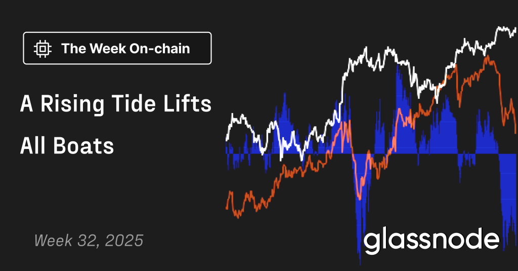 Bitcoin, dat in deze cyclus doorgaans beter presteerde dan de meeste altcoins, had in de tweede helft van juli een moeilijke periode. De koers zakte met 9% naar $112K en kwam in de lage-liquiditeitszone die in WoC 30 werd genoemd. Sindsdien herstelde de koers sterk en staat nu slechts 1% onder de all-time high, wat duidt op een nieuwe poging om de fase van prijsontdekking in te gaan.