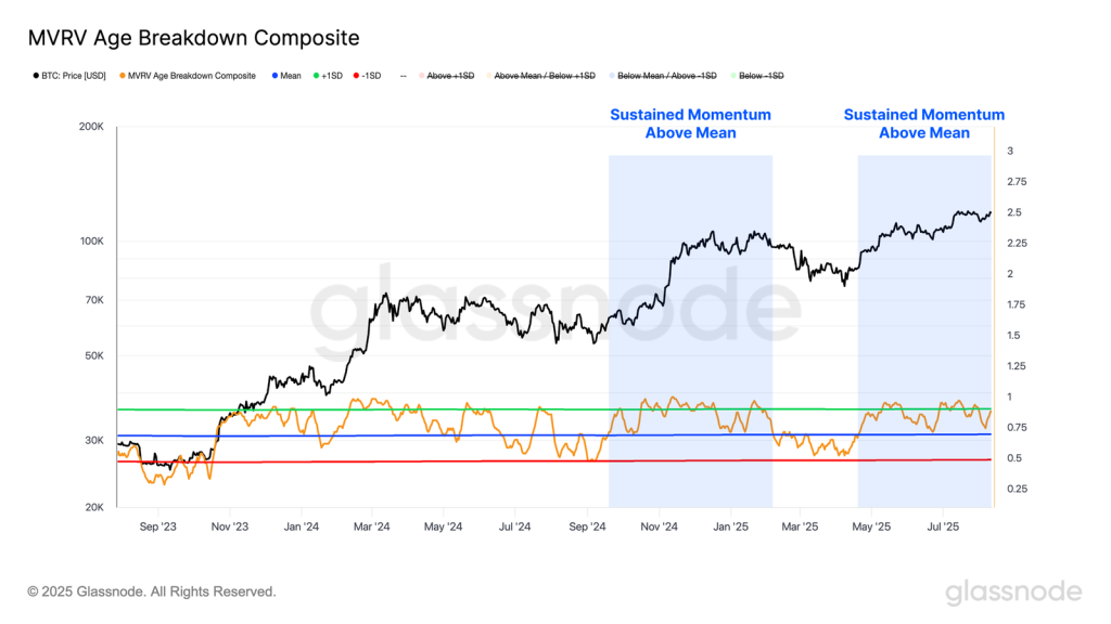 Met een gelijkgewogen samenstelling kan ook worden gemeten welk aandeel van leeftijdscohorten hun munten gemiddeld met winst vasthoudt. De oscillator bleef tijdens de correctie boven het gemiddelde, wat aangeeft dat de meeste investeerders winstgevend bleven. In combinatie met de geringe verliezen uit de STH-SOPR-metriek wijst dit op minimale capitulatiedruk en op een verbeterend marktsentiment.