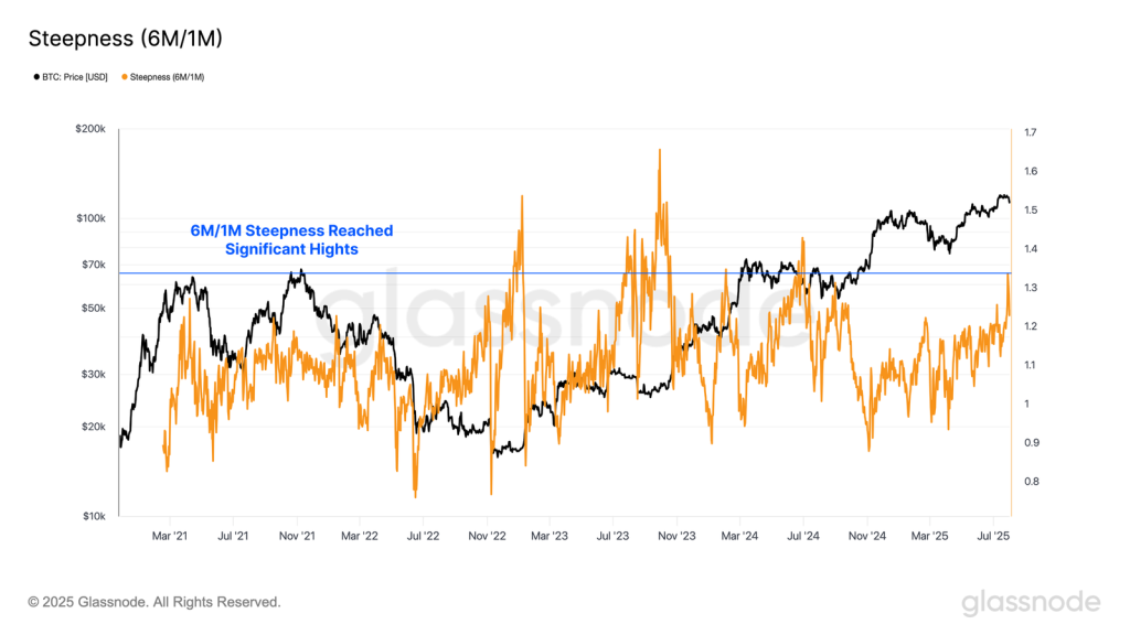 Ook de verhouding 6M/1M IV is steil, met slechts 3,2% van de handelsdagen met een hogere waarde. Dit betekent dat handelaren meer onzekerheid in de komende zes maanden inprijzen dan op korte termijn, wat duidt op hogere verwachte volatiliteit in de volgende twee kwartalen.