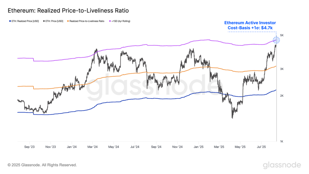 Voor Ethereum kan het +1σ Active Realized Price-niveau op $4,7k dienen als richtpunt. Historisch begint daar vaak de verkoopdruk. Dit niveau was in maart 2024 en meerdere keren in de bullmarkt van 2020–21 een plafond. Een doorbraak kan leiden tot een meer speculatieve fase, maar ook tot een scherpe omkeer bij sentimentverandering.