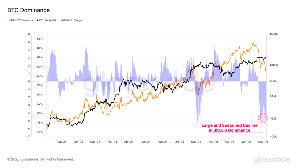Deze verschuiving van kapitaal is ook zichtbaar in de Bitcoin Dominance-metriek, die het marktaandeel van Bitcoin in de totale cryptomarktkapitalisatie meet. In de afgelopen twee maanden daalde de dominantie van 65% naar 59%, wat een voortdurende verschuiving van kapitaal naar risicovollere assets benadrukt.