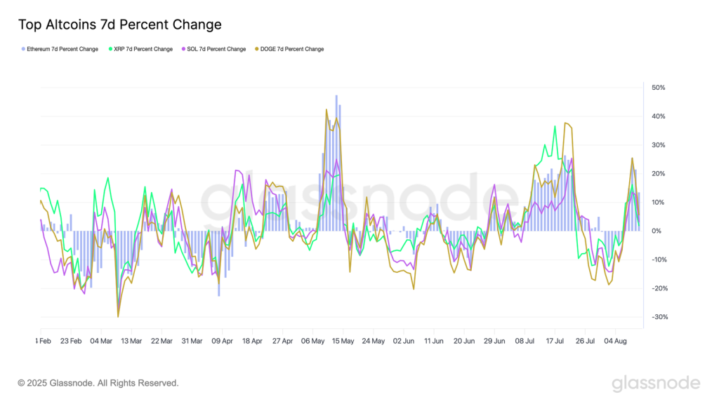 Bij het kijken naar het 7-daags procentuele koersverschil van grote altcoins (Ethereum, XRP, Solana en Dogecoin) zien we meerdere periodes van sterke prestaties in juli en augustus: