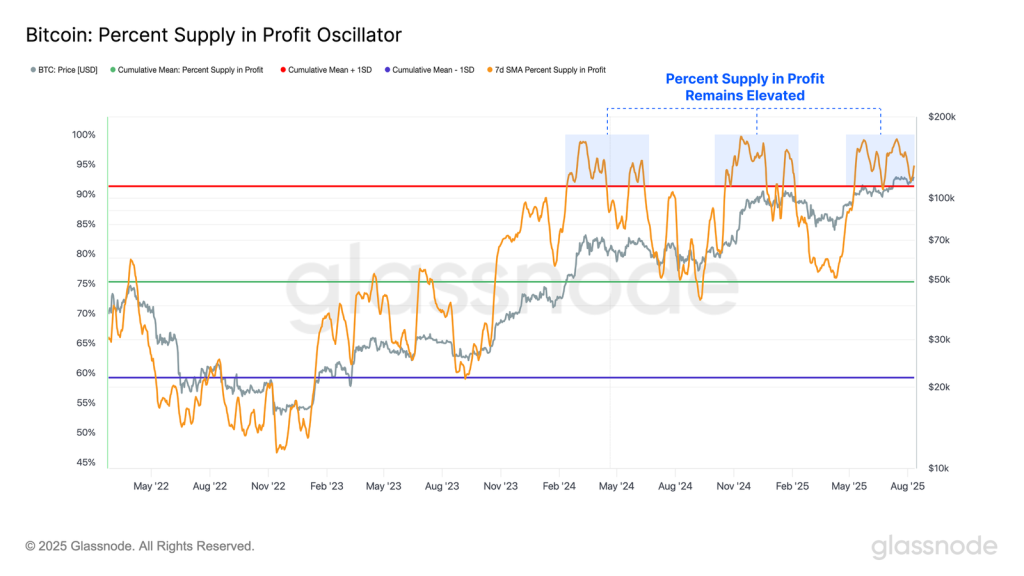 De recente opwaartse beweging wordt gesteund door sterke on-chain fundamentals. Het percentage van de circulerende voorraad in winstpositie bleef veerkrachtig tijdens de correctie en vond steun op het +1σ-niveau. Dit betekent dat een overgrote meerderheid (95%) van de investeerders nog steeds ongerealiseerde winst heeft.