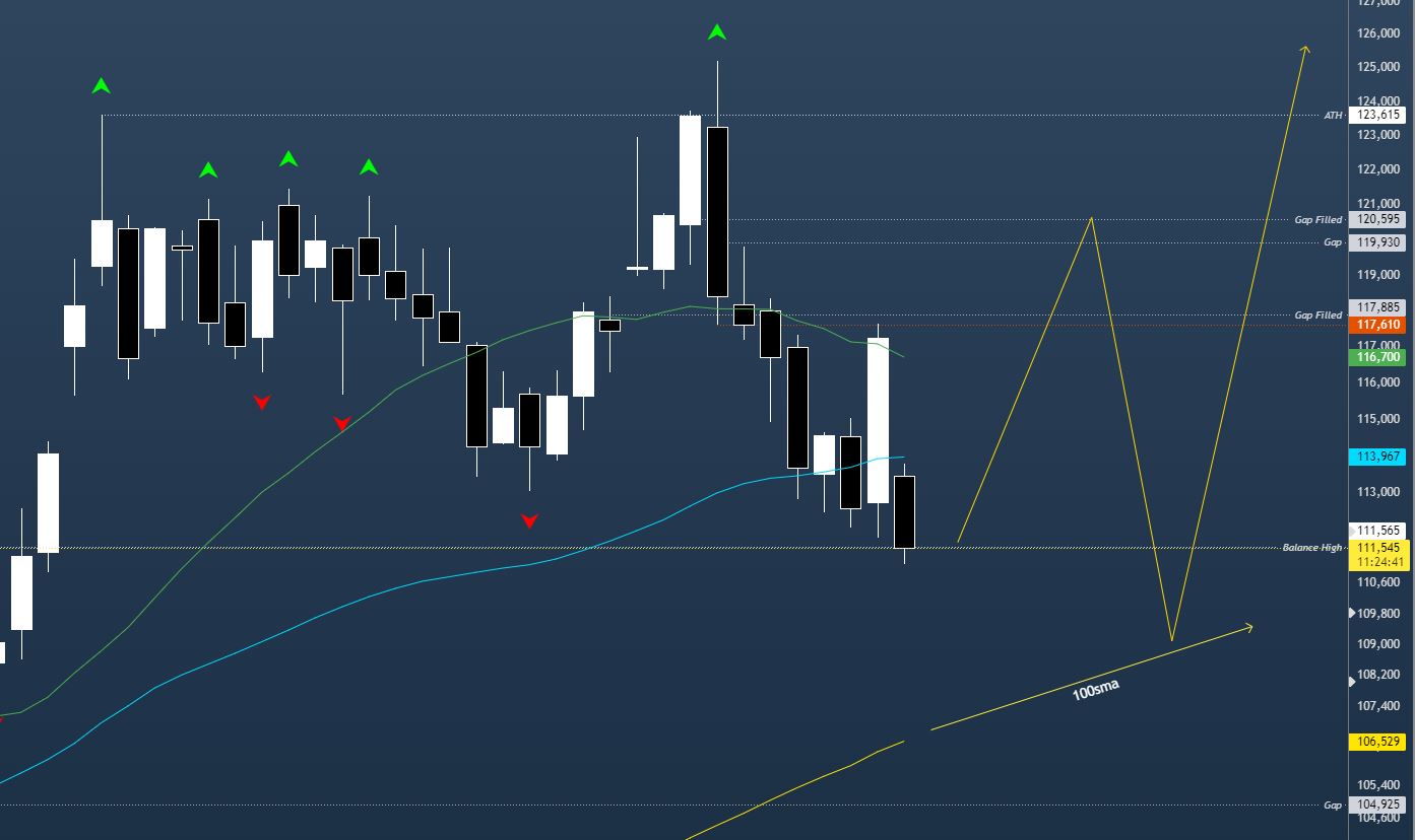 Met de chart hierboven wil ik zaten zien dat we binnen de range blijven met mogelijk een zoektocht naar lagere levels. Ik verwacht op dit moment nog geen nieuwe uitbraak naar boven. De gele lijn is een fictieve richting dus hecht hier geen waarde aan. Wat wel iets is om rekening mee te houden is de 100sma. Deze komt naarmate de tijd vordert meer omhoog. Deze zal als support level fungeren en zal halverwege September rond die $108.000 uitkomen. Aan de bovenkant hebben we nog een CME-gap op $120,595. Ik verwacht dat dit een weerstand zal zijn en voor mij een optie om een short te plaatsen.