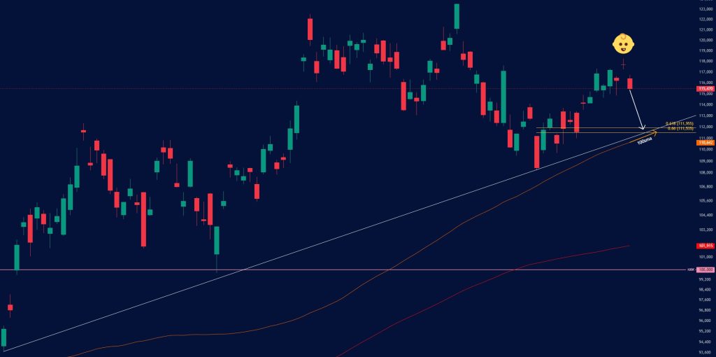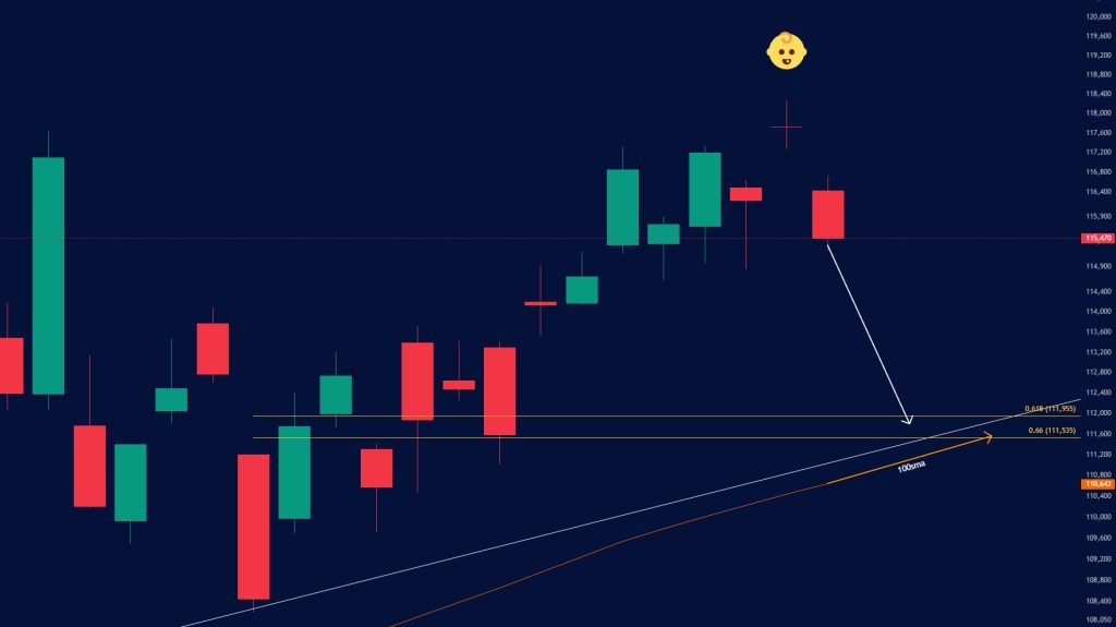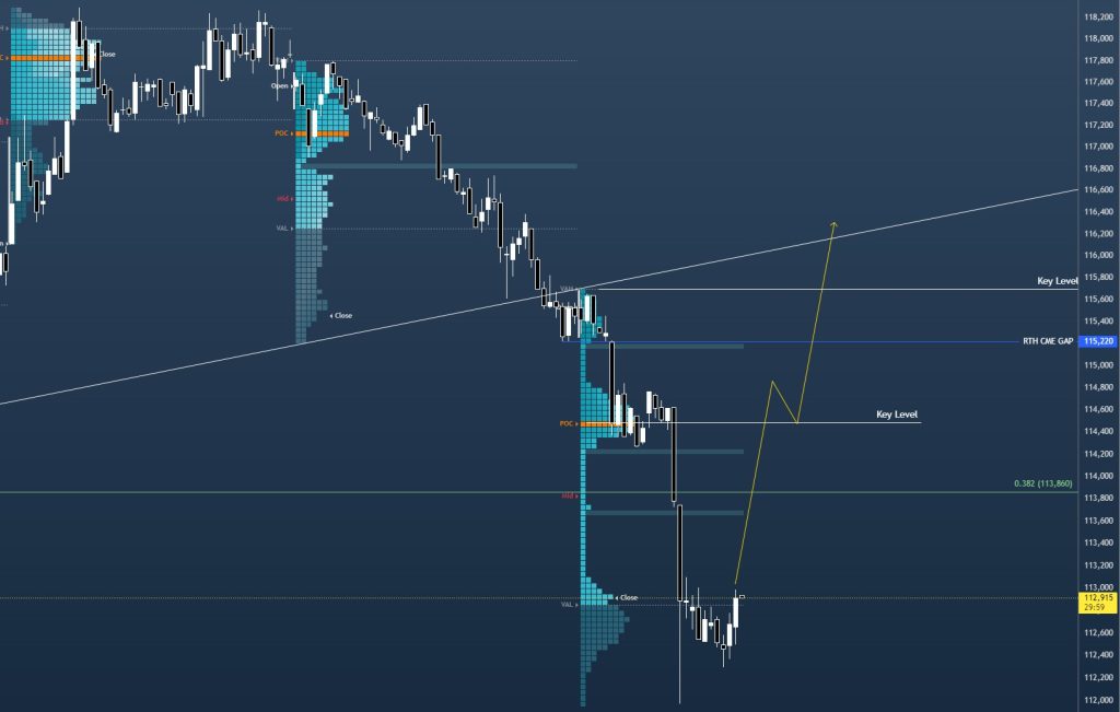 Bullish scenario zou zijn dat dit een ordinaire shake-out was om de late longs eruit te gooien. Hierin onderken ik 2 en eigenlijk 3 Key levels die we moeten claimen om te denken aan hogere prijzen. De eerste is $114,500 POC waarbij we daarna de gecreëerde CME gap sluiten en de terug traden binnen de vorige range. Dit scenario acht ik kleiner gezien de periode waar we in zitten. Het is nog steeds september en de gevolgen van een beleidswijziging van de FED heeft altijd een delay.