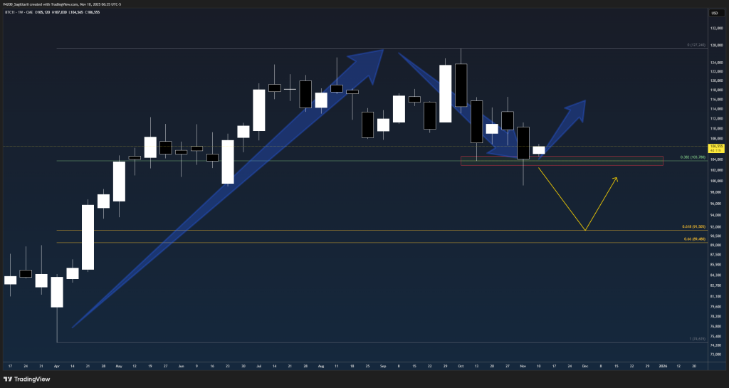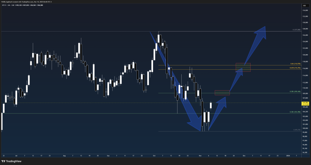 Op de Bitcoin CME-weekgrafiek valt op dat de koers de 0,382 Fibonacci-retracement overtuigend heeft gehouden. De zone rond $104.000 fungeert opnieuw als belangrijk steungebied en bevestigt de onderliggende kracht van de markt.