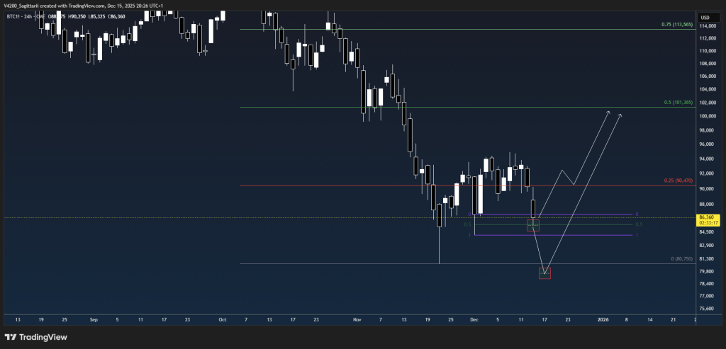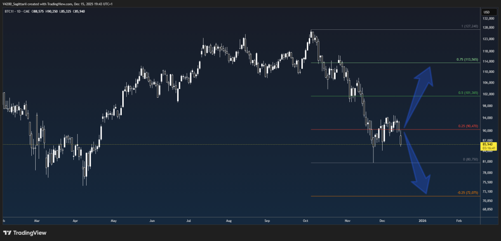 In een week waarin macro-economische signalen elkaar tegenspreken en centrale banken uiteenlopende richtingen inslaan, bevindt de markt zich in een staat van bijna volledige onzekerheid. Die onzekerheid vertaalt zich ook duidelijk in het koersverloop van Bitcoin, waar richting ontbreekt en de markt zichtbaar wacht op een externe impuls. Technisch gezien bevindt Bitcoin zich in een spanningsveld waarin twee scenario’s domineren. Een overtuigende uitbraak aan de onderzijde kan de weg openen richting het $72.000-niveau. Aan de bovenkant ligt $113.500, waar eerdere prijsactie wijst op stevige weerstand.