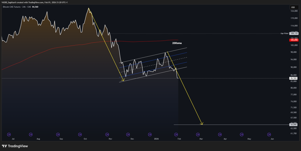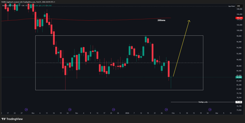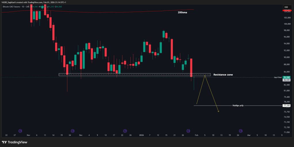 Binnen het meest bullish scenario zou de dragonfly doji het startpunt vormen voor een herstelbeweging waarbij de prijs eerst terugkeert richting de box (om de CME gap zo veel mogelijk te sluiten) en daarna doorstoot richting de 200-day simple moving average (200sma). In deze context fungeert de 200sma juist als zware resistance: een niveau waar verkopers vaak opnieuw actief worden en waar de markt kan overgaan van herstel naar rejection. Een afwijzing rond de 200sma zou passen bij het idee dat de eerdere bullrun daar zijn laatste energie verbruikt, waarna een nieuwe fase van correctie kan inzetten.