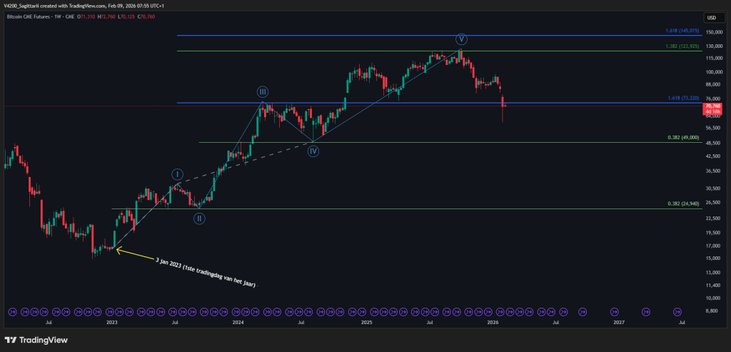 De grafiek toont de volledige impulsieve opwaartse beweging die Bitcoin vanaf begin 2023 heeft doorgemaakt en die in oktober 2025 haar voorlopige hoogtepunt bereikte. Vanaf de eerste handelsdag van 3 januari 2023 ontwikkelde de markt een klassieke Elliott Wave-structuur, waarin vijf opeenvolgende golven elkaar logisch opvolgden. De stijging werd gedragen door toenemend momentum, groeiende liquiditeit en een steeds optimistischer marktsentiment, wat uiteindelijk resulteerde in een duidelijke wave 5-top.