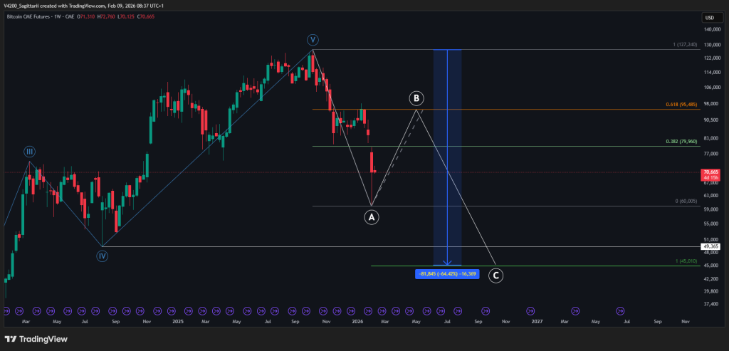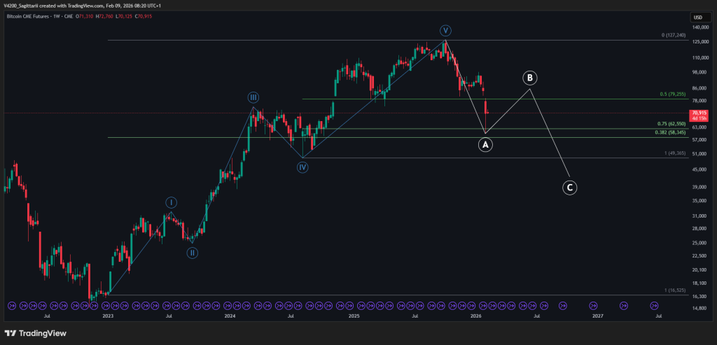 In dit geval ligt die cruciale wave 4-zone rond de $45.000. De volledige correctie bedraagt dan ~65%. Dit is relatief weinig gezien de vorige bearcycles, echter wat dit enigszins kan bekrachtigen is de enorm zwakker 2025 en het zakken beneden de 4th halving prijs. Daarnaast is wave C de 1:1 van wave A.