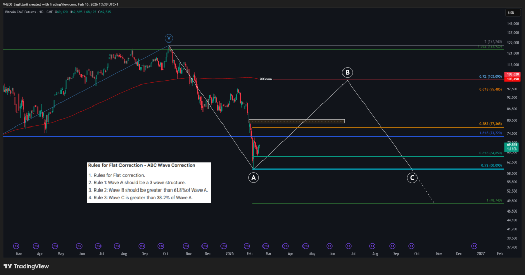 Op de BTC CME daily chart lijkt de recente scherpe daling richting de zone rond $60.000–$65.000 technisch goed te passen als een afgeronde Wave A binnen een mogelijke Flat ABC-correctie. De structuur van de daling oogt impulsief en voldoet aan de klassieke voorwaarden van een flat, waarbij Wave A corrigerend is en ruimte laat voor een krachtige tegenbeweging. In dat kader kan de huidige opleving worden gezien als het begin van een potentiële Wave B, die binnen een flat vaak verraderlijk bullish oogt.