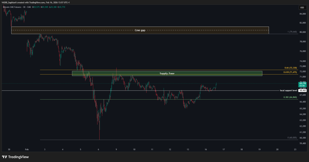 Boven de huidige prijs ligt een uitgesproken supply zone rond $71.500–$72.300, die samenvalt met de 0.618–0.66 retracement van de volledige daling. Dit vormt een sterke confluence van resistance. Daarboven ligt de openstaande CME-gap rond $79.600–$80.000, wat technisch als magneet kan fungeren indien de markt voldoende momentum ontwikkelt. Een overtuigende doorbraak van de supply zone zou de weg vrijmaken richting deze gap en past binnen het grotere B-wave scenario richting hogere timeframes.